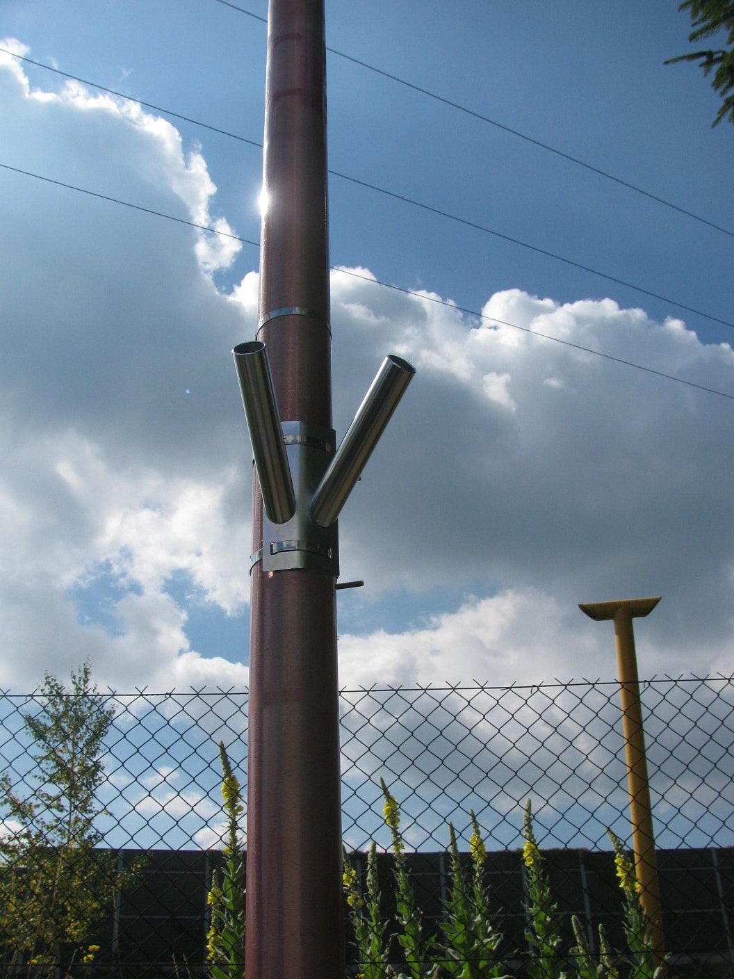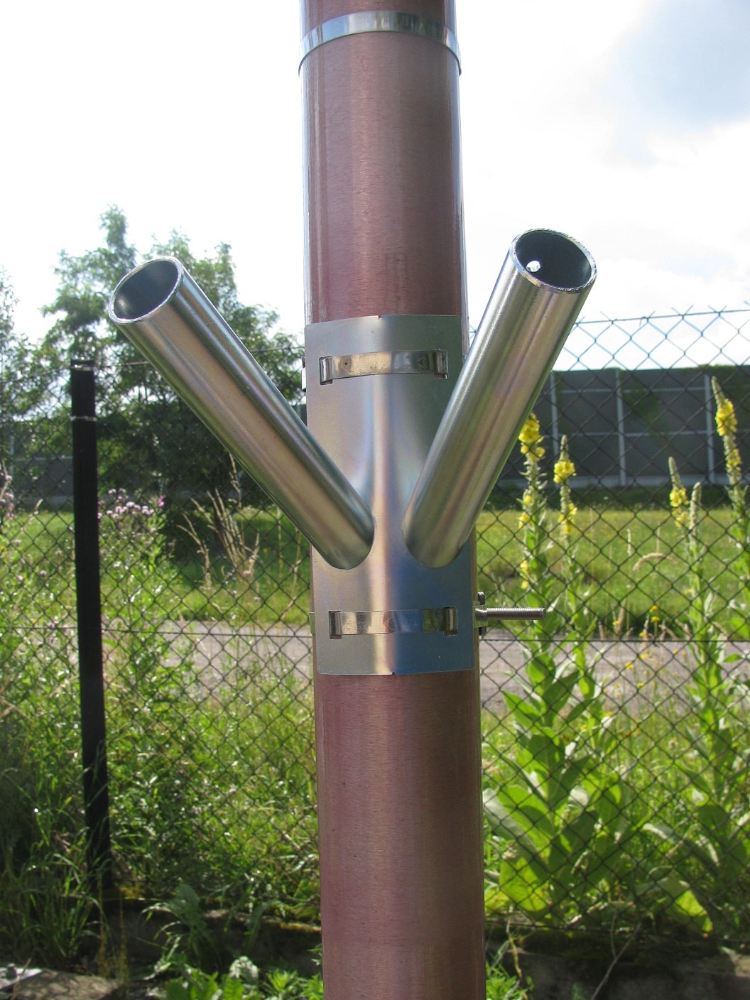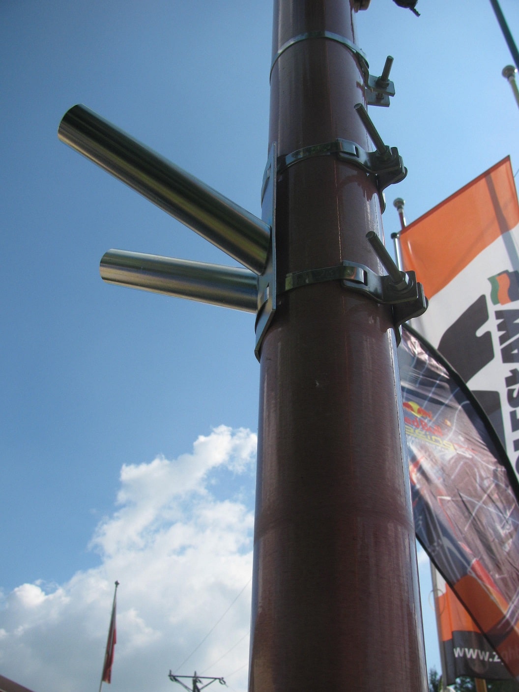 - Fixez le support du drapeau au poteau ou lampadaire, serrez les colliers avec les pièces de serrages insérées dans les supports de montage et serrez les écrous avec une clé. Après avoir monté le support porte-drapeau, les hampes sont fixées aux support et fixées avec des vis