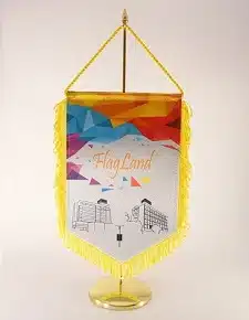 Fanion personnalisé avec socle en laiton poli – code SBU010 pour 1 fanion publicitaire. Description fanion: satin avec ou sans franges, différentes tailles disponibles. Fanion personnalisé recto-verso. FlagLand est un fabricant de fanions publicitaires. L’utilisation de fanions personnalisés est une technique de publicité qui continue de susciter l’intérêt de beaucoup de personnes.