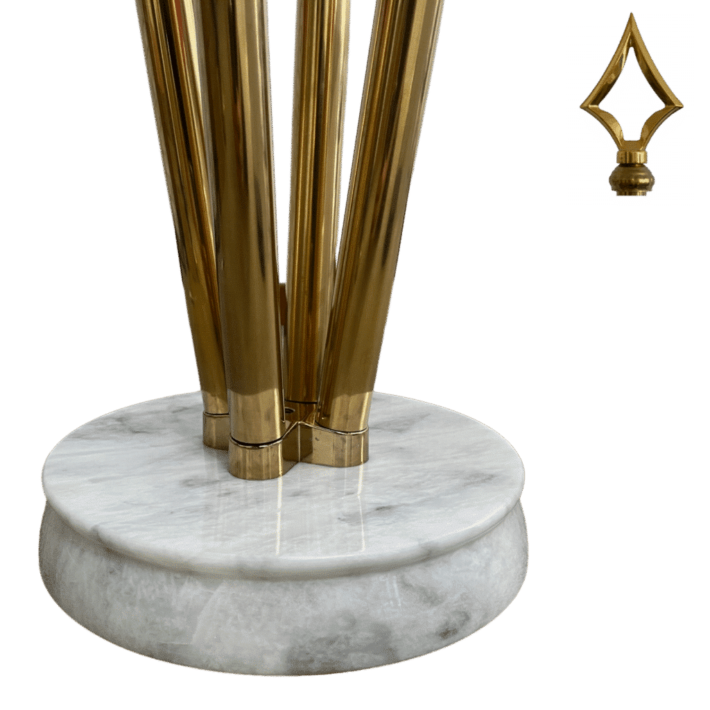 Socles en marbre blanc et mâts en inox, finition dorée