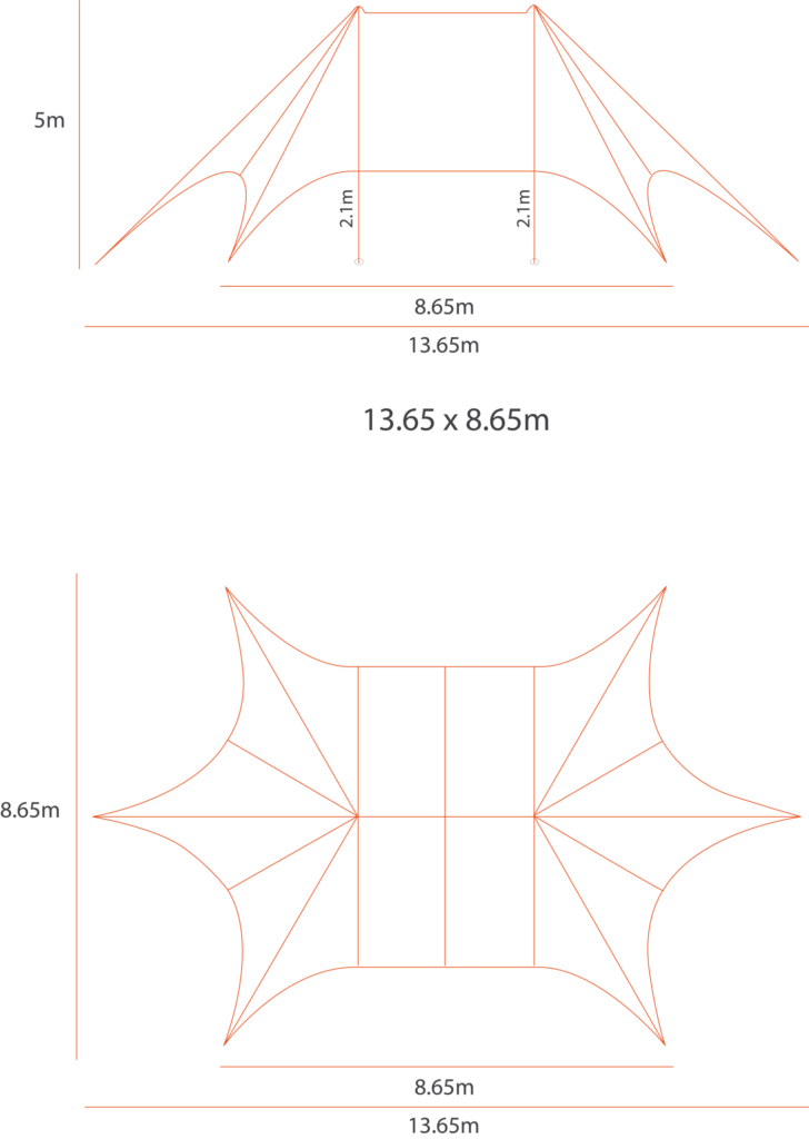 Les dimensions de cette tente étoile sont très avantageuses : son longueur de 13,65 mètres et sa hauteur maximale de env. 5 mètres offre un large espace couvert pour créer un bar ou un endroit où abriter vos visiteurs lors de vos événements et réception.